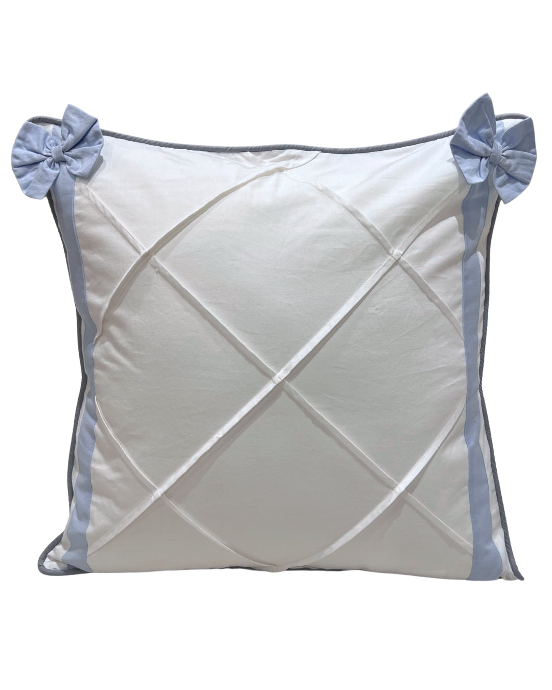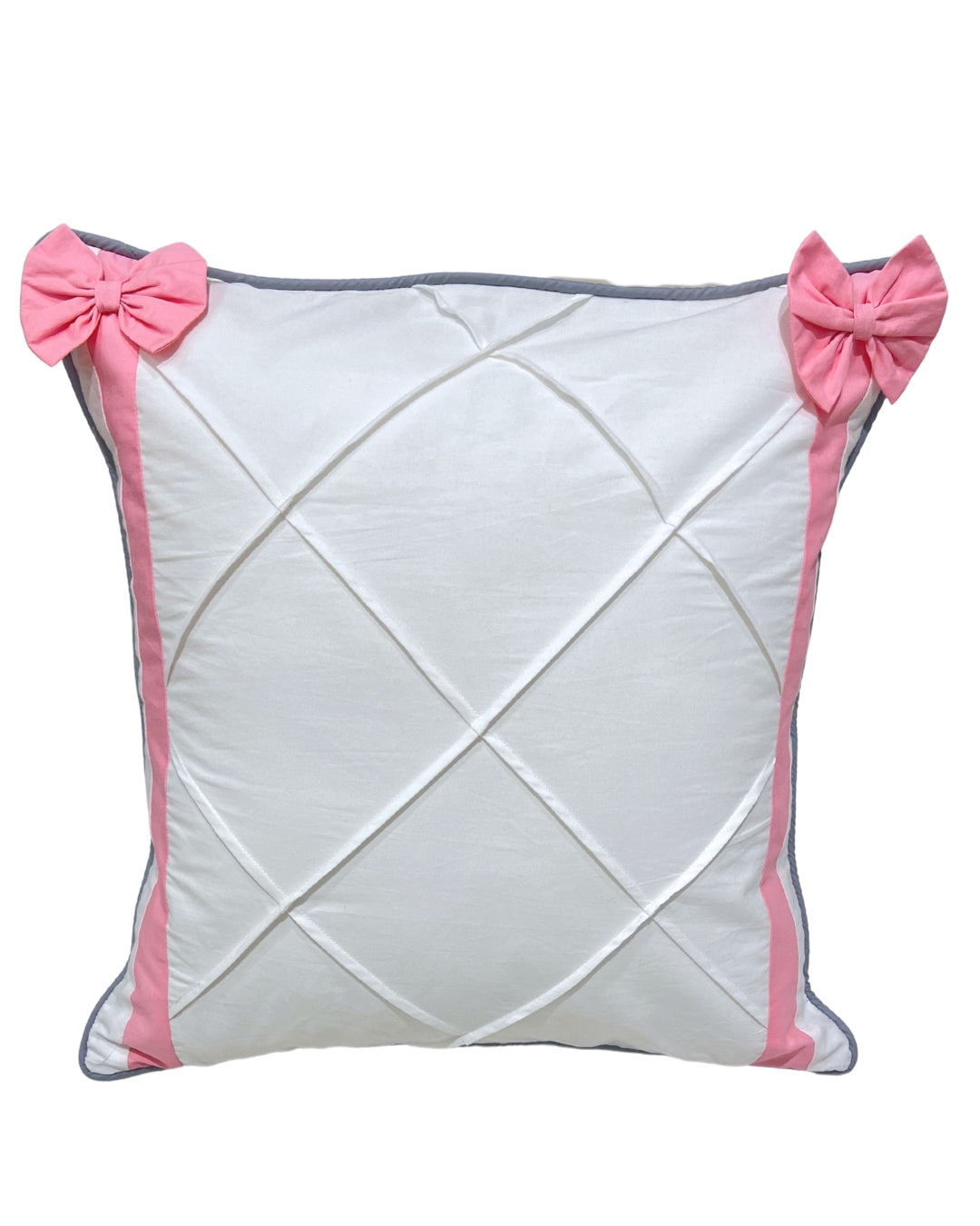 Add a pop of whimsy to any nursery or living space with our Bow-Trim Pleat Cushion Cover. Expertly crafted from 100% cotton, its delicate fabric pleats and corner bows create a charming & chic dimensional look.