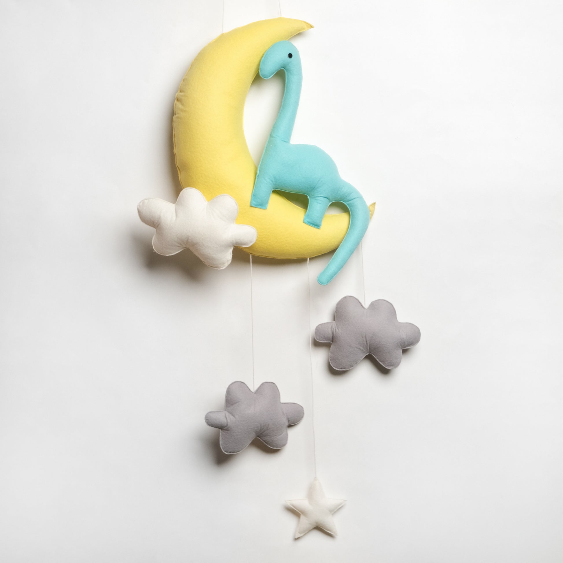 Bring prehistoric magic to bedtime with our Moonrise Dino, a felt nursery wall hanging featuring a friendly dinosaur perched on a crescent moon with soft clouds and a star. This gentle, gender-neutral baby mobile alternative adds movement and whimsy above a crib or cot and is perfect for a dinosaur-themed nursery or playroom. A thoughtful baby shower gift and Instagram-worthy kids room decor piece.