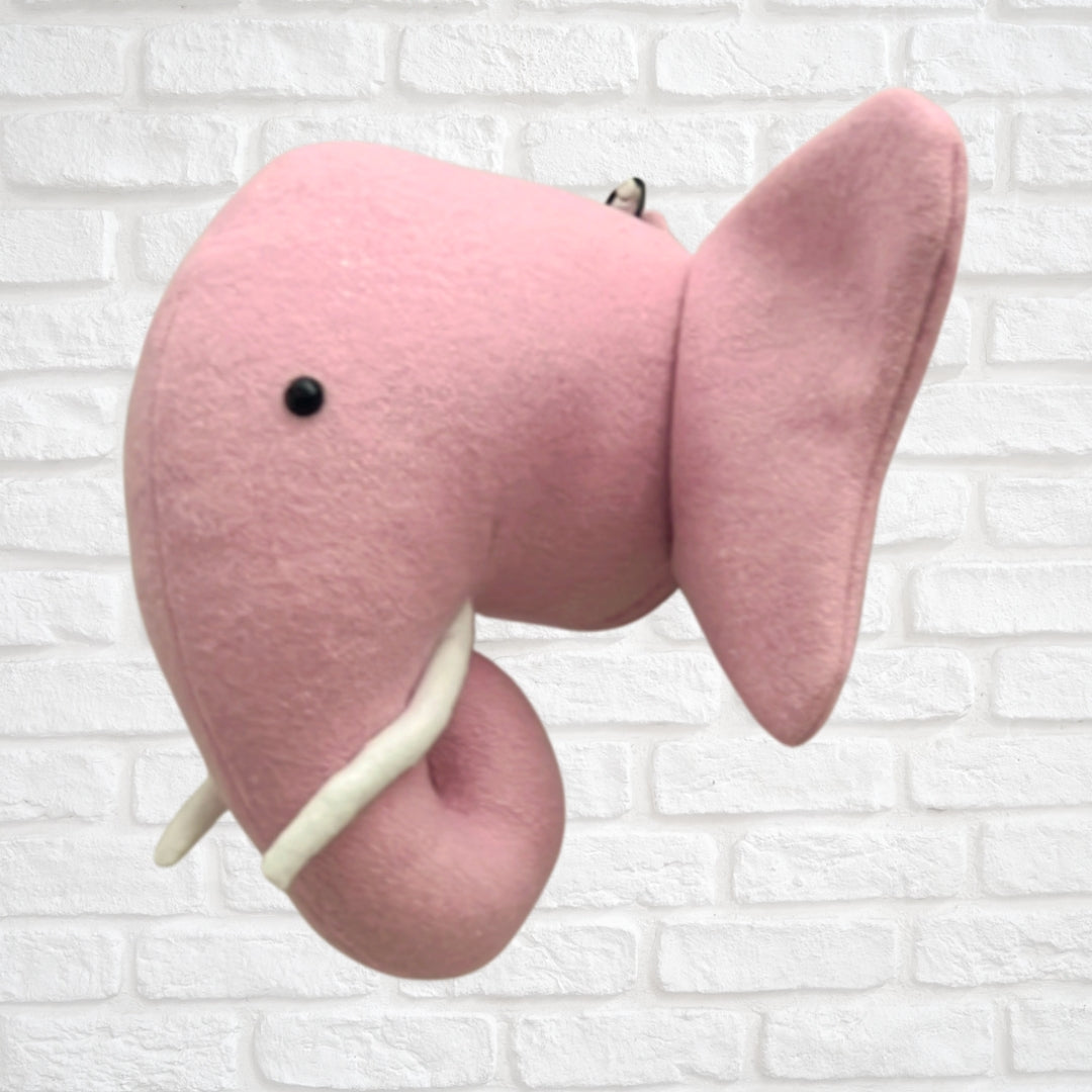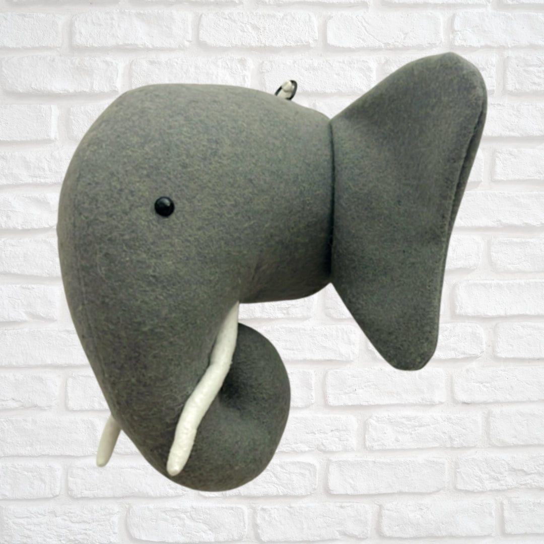 Animal themes are always fun in a kid's room. This minimalist elephant wall mount stuffed plush animal head is the perfect accent to any child's room. The head is backed with an inner disc of plywood for strength so it hangs neatly on the wall from a loop at the back.