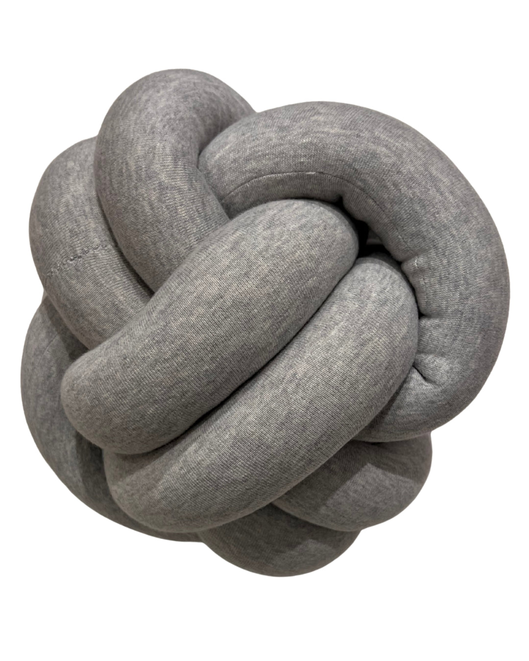 Trendy knot-style accent pillow in soft grey cotton jersey - ideal for nursery shelves, reading nooks, or as a decorative throw cushion.