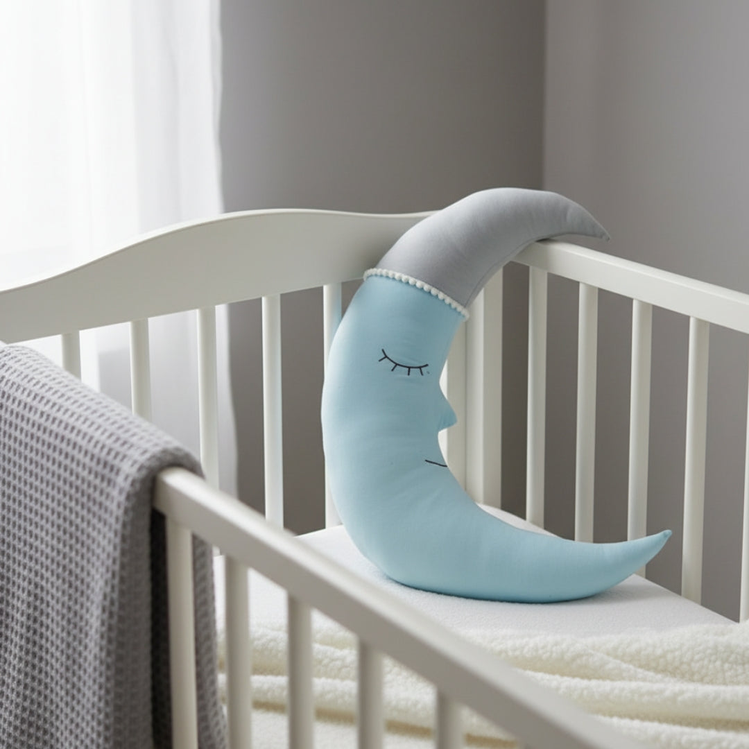 Lay your little one to sleep peacefully with this cute and cosy moon shaped cushion on the side ! It's sleek curvy shape makes it easy for the little ones to grab on to and play!