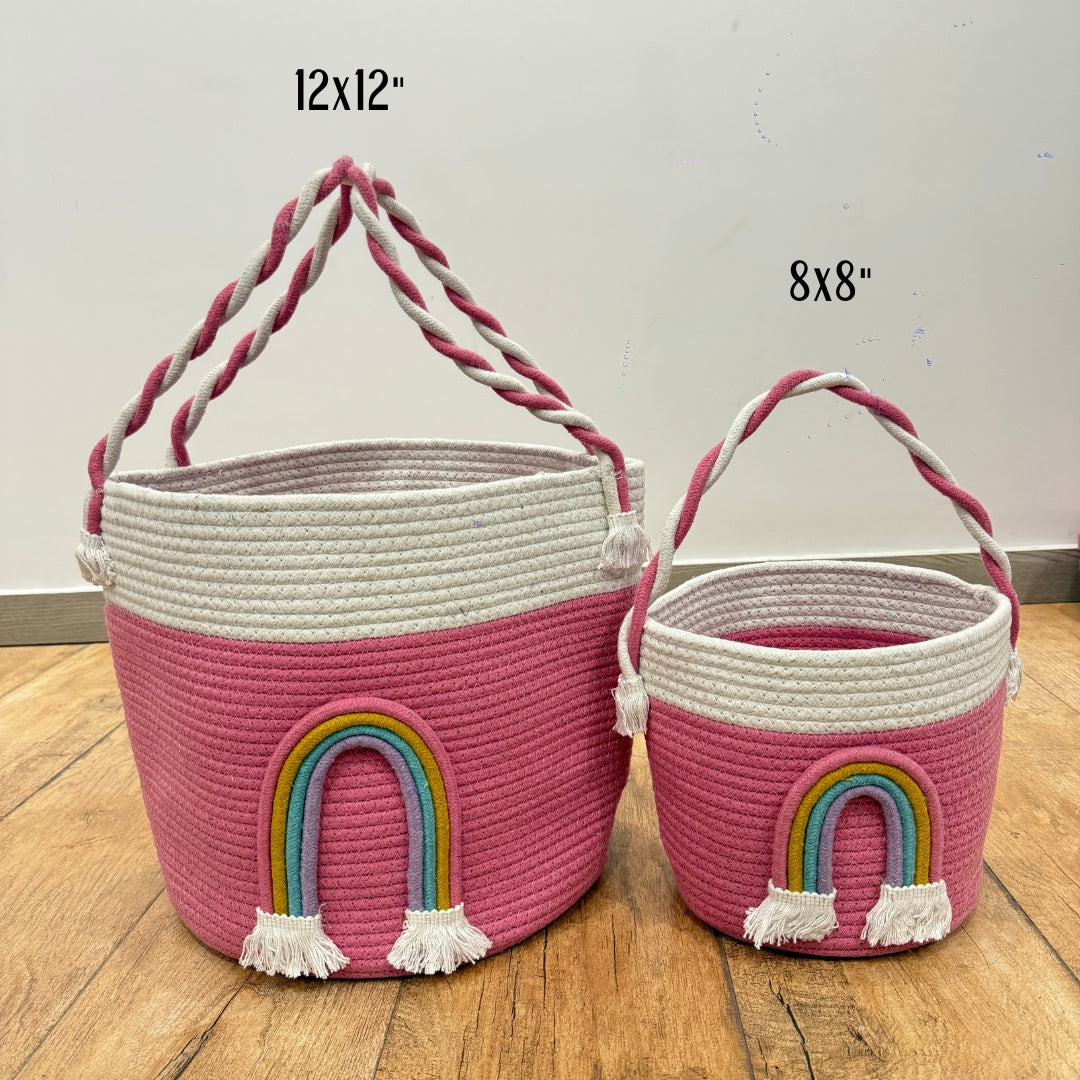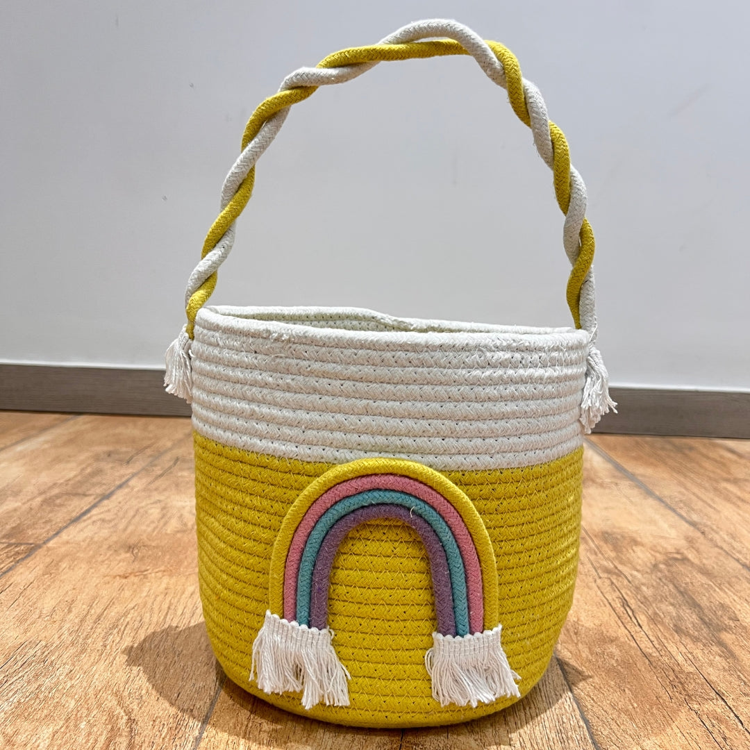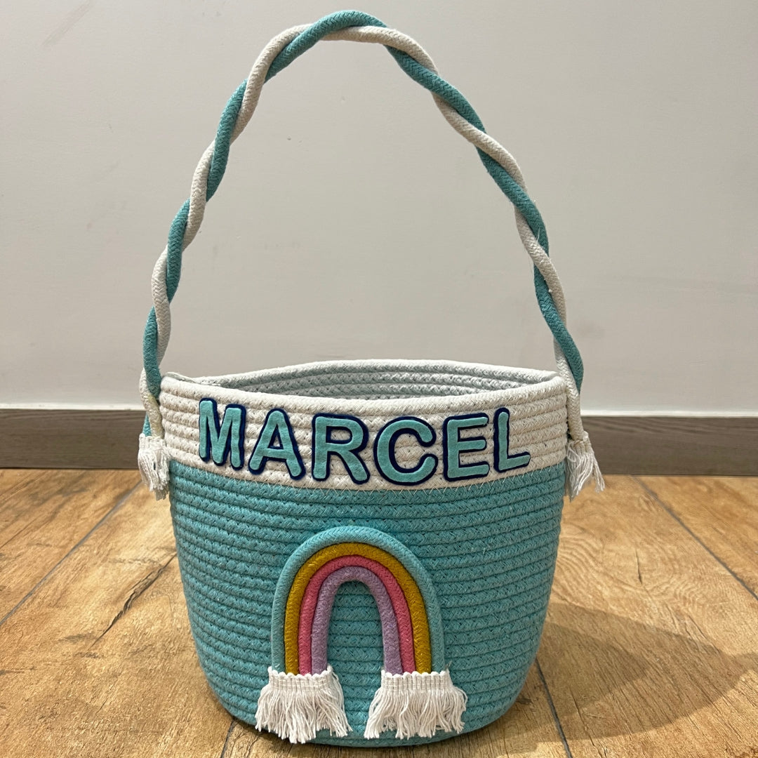 Let your little one tote around joy with our Rainbow Cuddles Carry Basket! Hand-braided from soft, natural cotton rope, this cheerful basket features a vibrant rainbow applique and a sturdy twisted handle — perfect for easy carrying by tiny hands. Whether it's for toy storage, Easter egg hunts, LEGO storage or stylish nursery organization, this basket is as functional as it is fun. Available in cheerful Blue and Pink, and customizable with your baby’s name, it also makes for a heartwarming gift or a charming addition to a personalized hamper.