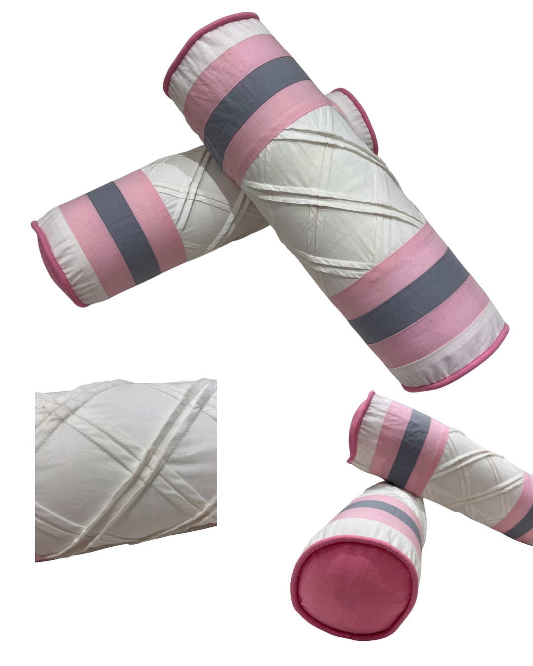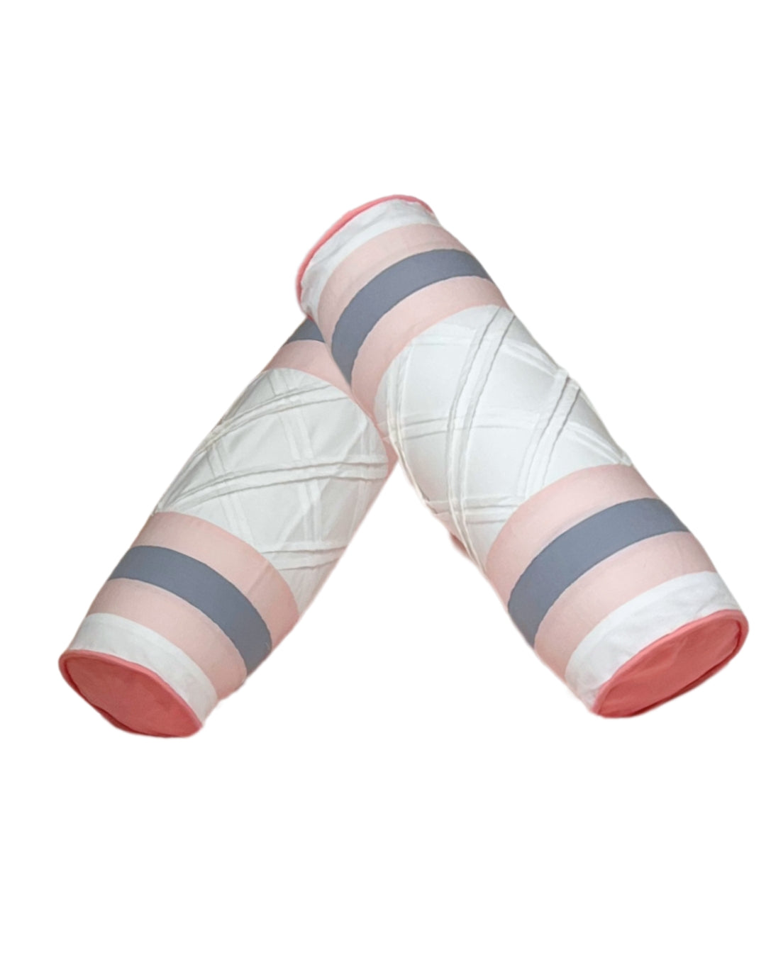 Two bolsters in 100% cotton with tonal stripe panels and velcro closures. Ideal for nursery decor, stroller support, or little arms to hug close.